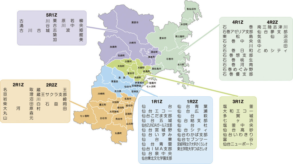 地区ガバナーは、地区管理のため、地区をいくつかの「リジョン」に分け、さらに、そのリジョンを複数のクラブから成る「ゾーン」に分けます。
